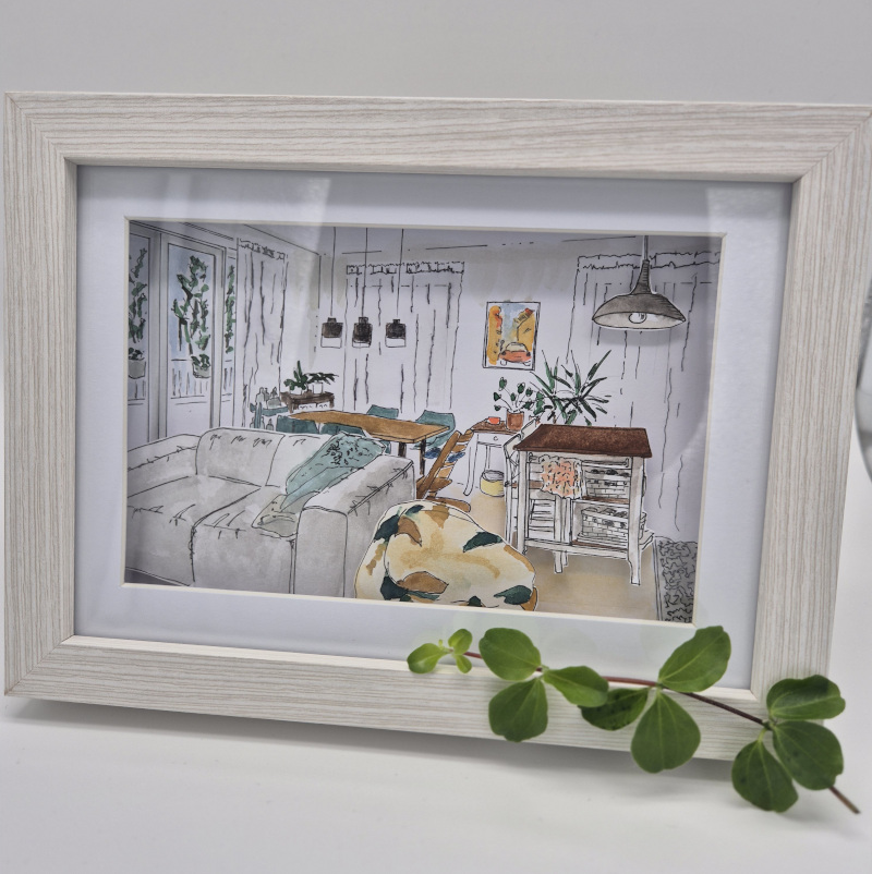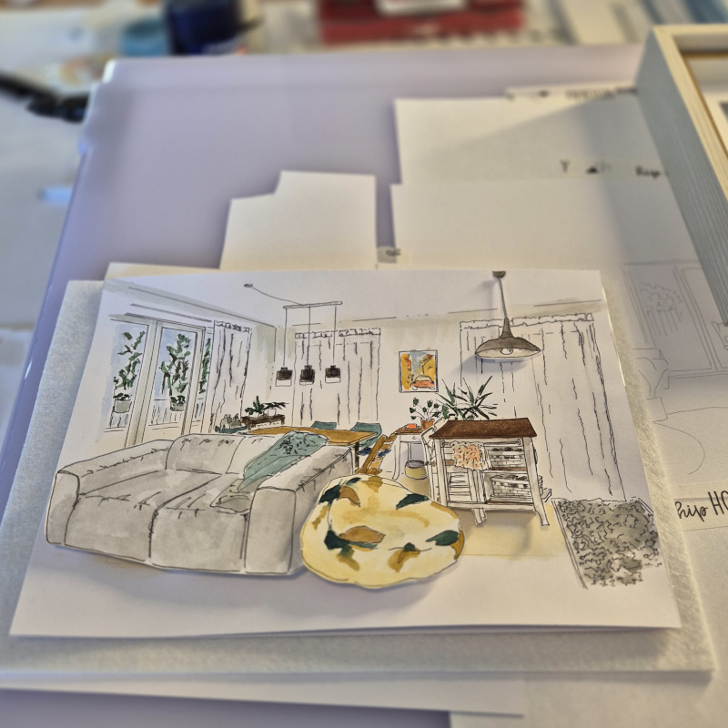 The diorama was commissioned as a farewell gift for a move. So the good spirits of their previous favorite home will continue to accompany the family. A little secret: The family dog lives forever as an illustration on the back.