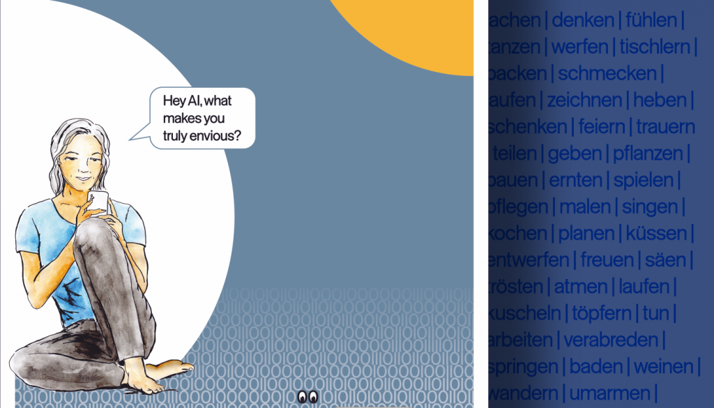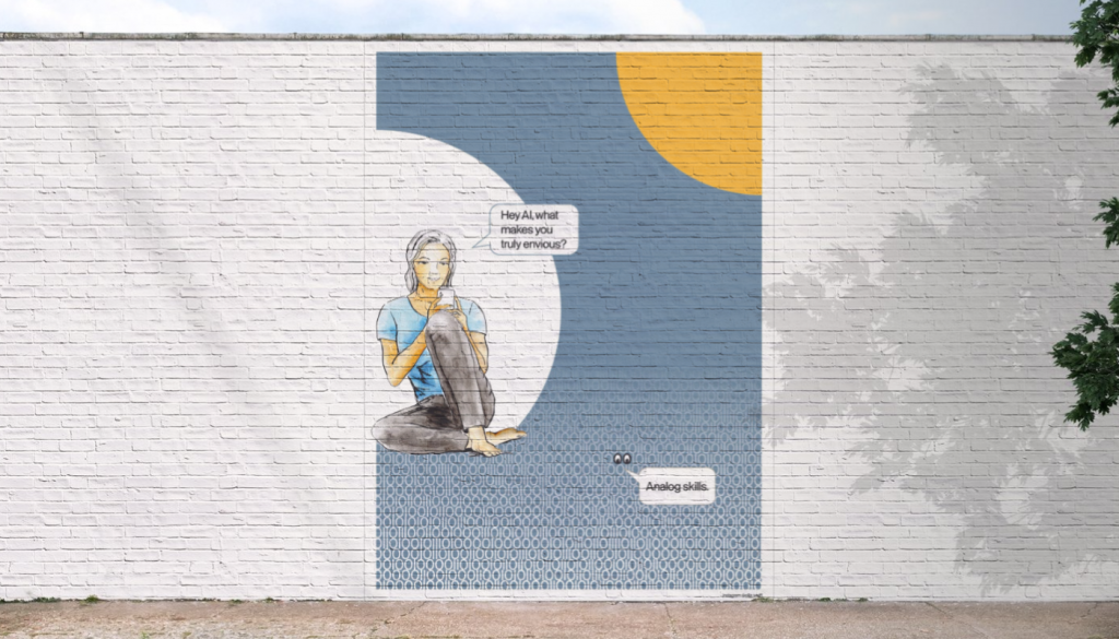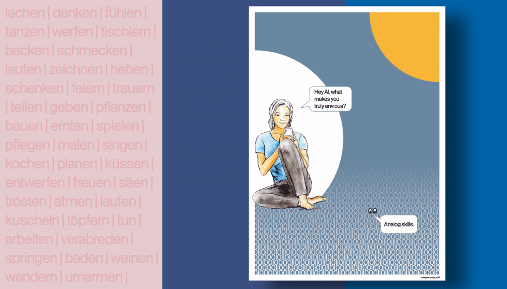 Hintergrund zu meinem Beitrag: Auf den ersten Blick zeigt das Poster nur einen flachen Witz. Aber AI drängt mit massiven Druck in unsere Routinen und Arbeitsweisen. Das Besinnen, wie viele andere, großartige Fähigkeiten wir besitzen, kann eine Antwort auf die negativen Auswirkungen des Drucks sein. Es setzt ihm Selbstermächtigung und Handlungsfähigkeit entgegen.